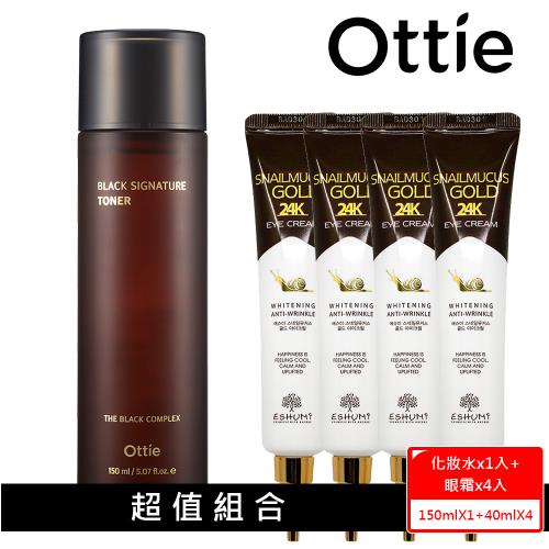 (買1送4)韓國OTTIE 黑鑽蝸牛珍珠胜肽撫紋菁華露150ml(效期2026.10)-贈Eshumi黃金蝸牛青春無痕撫紋眼霜40mlx4入