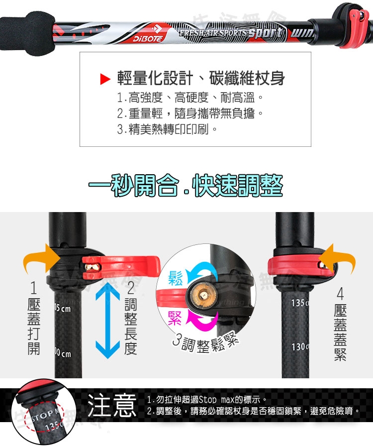 2.手杖除了做健走、徒步及登山用之外,請勿作為其他用途。