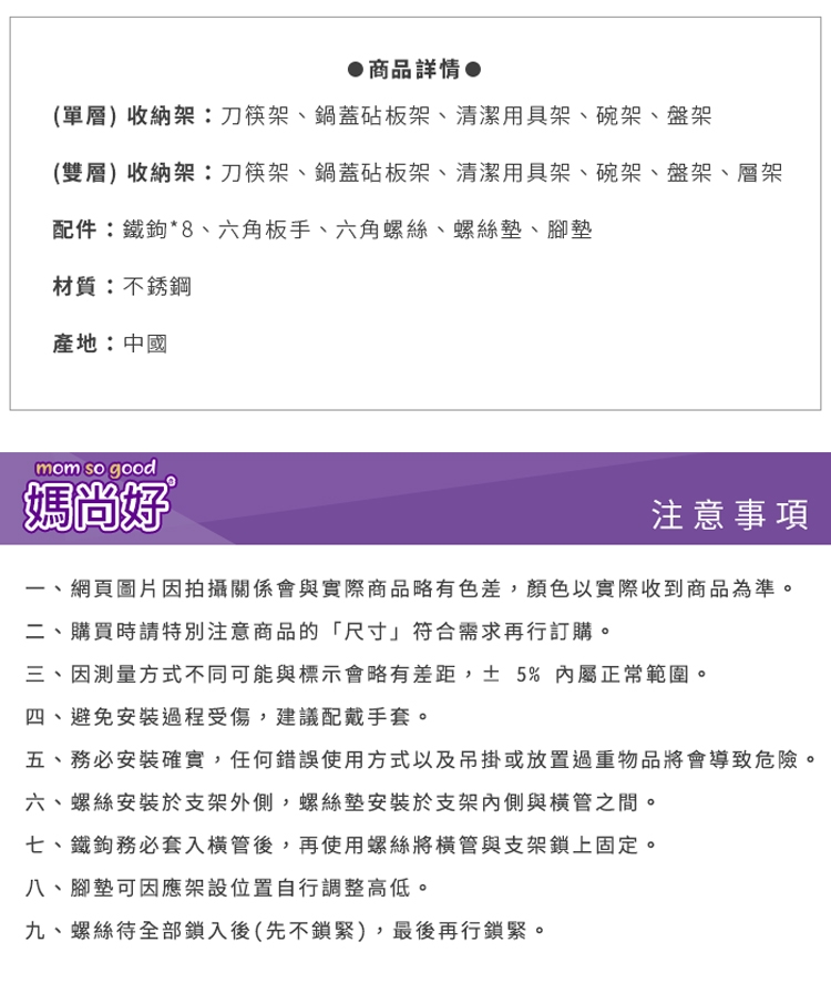 五. 務必安裝確實,任何錯誤使用方式以及吊掛或放置過重物品將會導致危險。