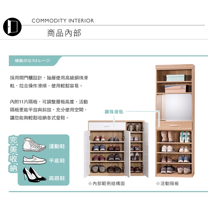 對開門櫃,拿取方便,內附11片活動層板,輕鬆規畫擺放各式鞋款!