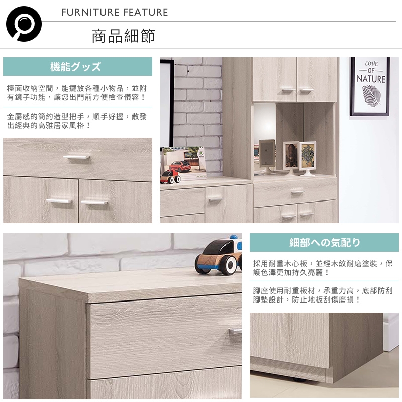 鏡面設計,讓您出門前可再檢視妝容,開放式檯面,可擺放常用小物!