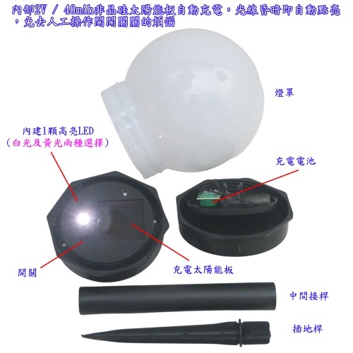 ■內部2V / 40mAh非晶硅太陽能板自動充電,光線昏暗即自動點亮,免去人工操作開開關關