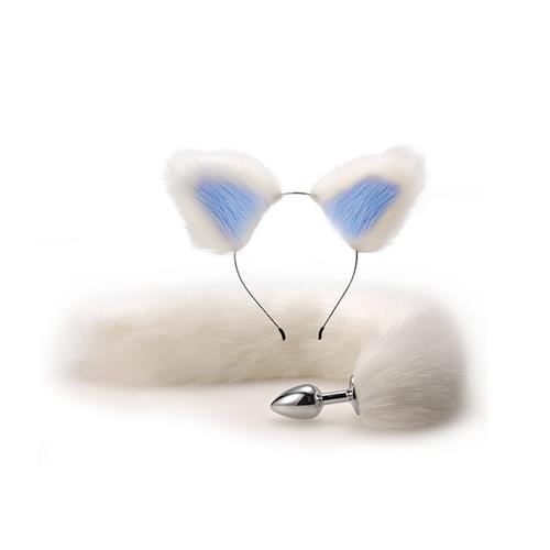 角色扮演 性感裝扮 後庭肛塞按摩器 妖豔小狐狸角色扮演 毛絨耳朵+不鏽鋼肛塞尾巴 狐狸尾 白藍
