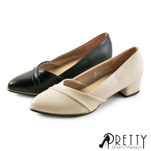 Pretty 女 低跟鞋 反摺 斜口 金邊 尖頭 粗跟 台灣製BA-23811