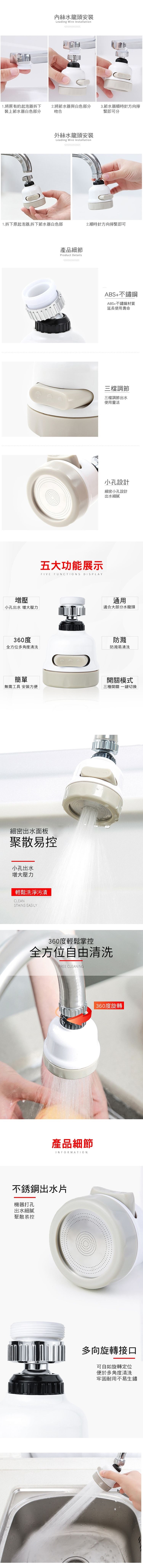 這款增壓花灑採用ABS材質,花灑可分三段出水方式,可360度自由旋轉,任意角度出水,防濺水,節水20~30%,搭配萬能轉接頭,內外牙自由轉換,適合大多數圓型水龍頭,讓妳無論在廚房、浴室、陽台...都不再受到出水不順暢的困擾~