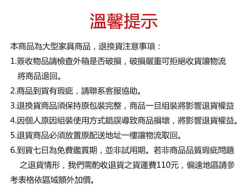 3.退換貨商品須保持原包裝完整,且不得於紙箱上書寫字樣,商品一旦組裝將影響退貨權益。