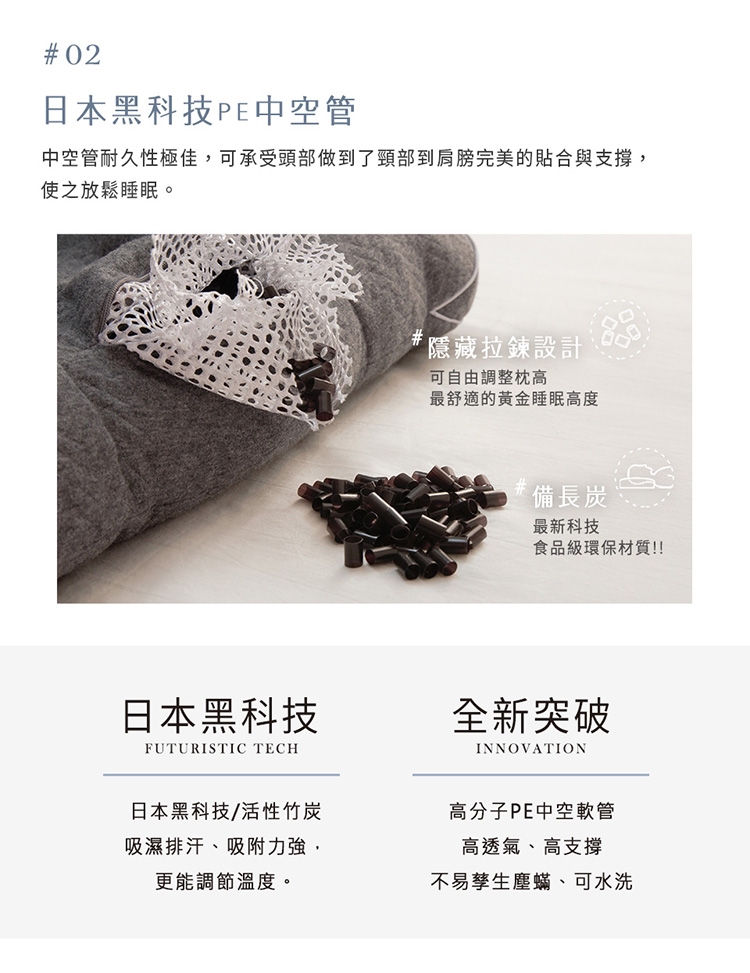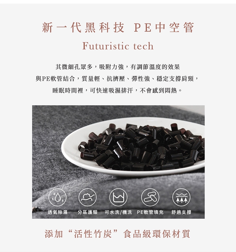 添加活性竹炭, 其微細孔眾多,吸附力強,有調節溫度的效果,與PE軟管結合,質量輕、抗擠壓、彈性強、穩定支撐肩頸,睡眠時間裡,可快速吸濕排汗,不會感到悶熱。