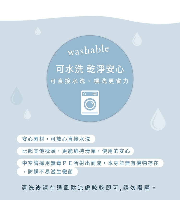 可用清水清洗,比起其他枕頭,更能維持清潔,使用的安心。