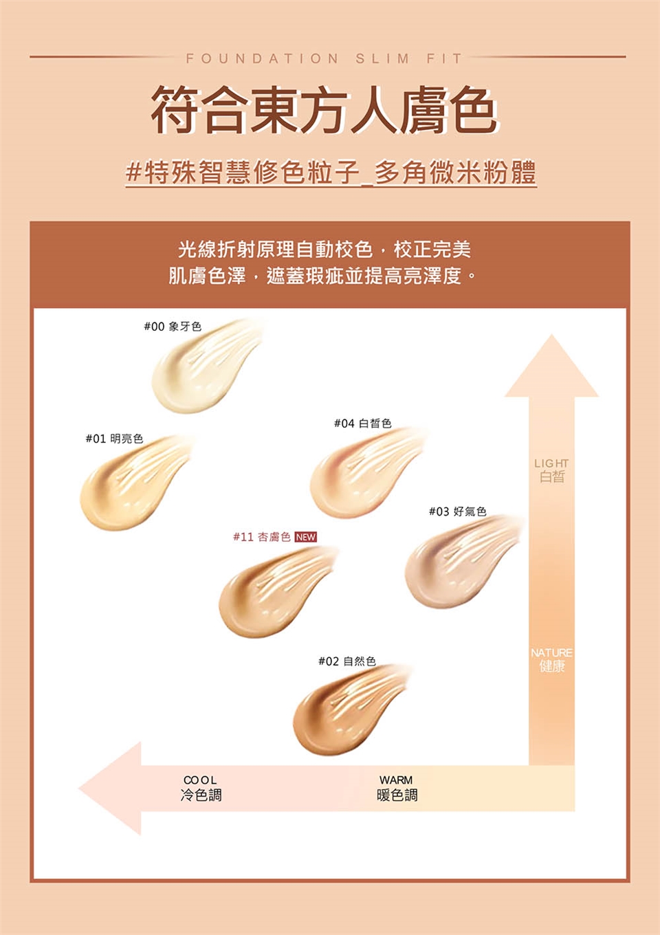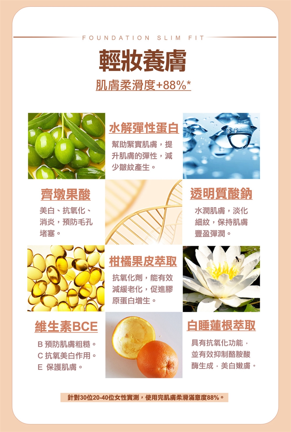 擠出適量粉底液,塗抹在要修飾的部位。再用布丁粉底刷推開粉底液,即可使妝感迅速吸收,輕、薄、透均勻服貼,打造自然妝感