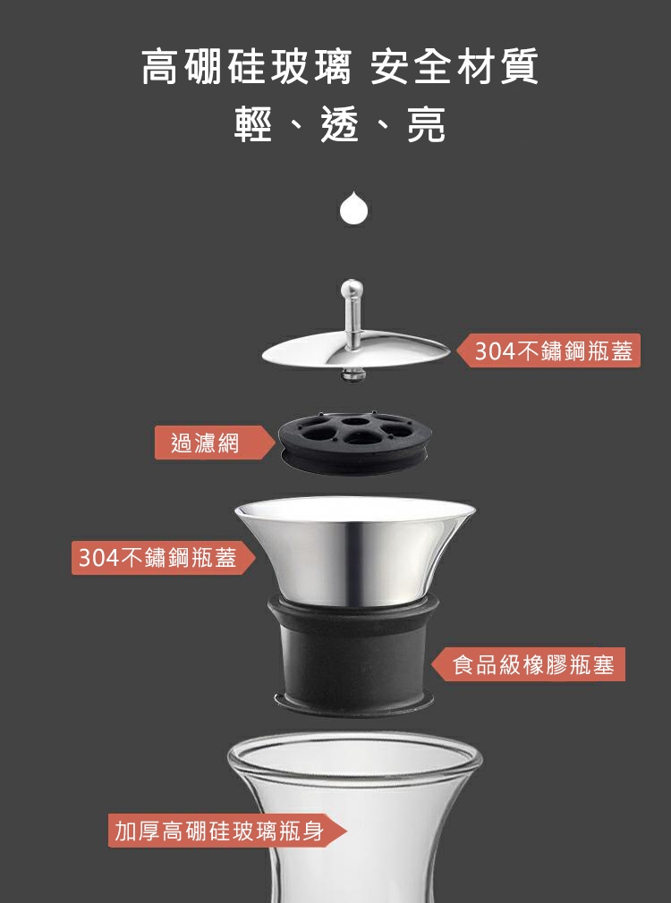 材質:瓶身/高硼硅玻璃 瓶蓋/304不鏽鋼
