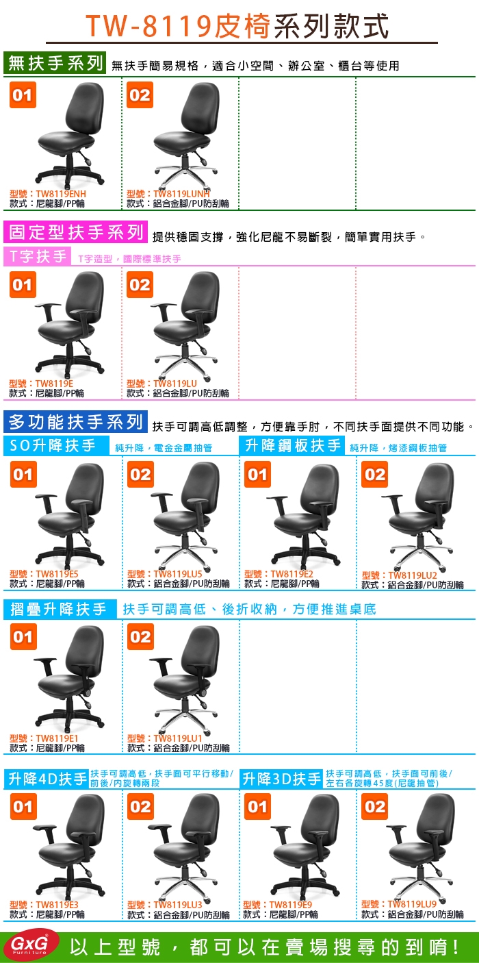 ※本款TW-8119 短背電腦椅,提供多種款式可選,可以依據需求購買唷,如找不到型號,可洽賣場客服!