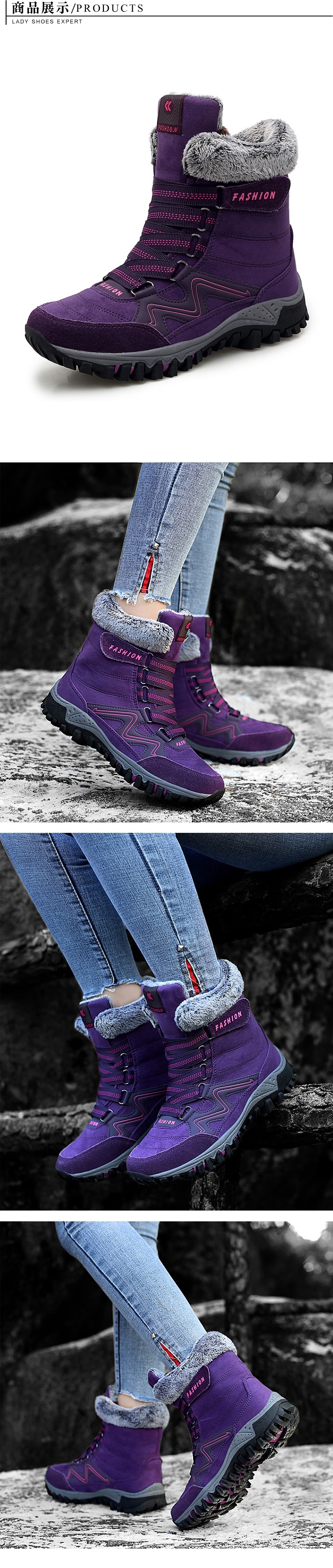 【MINE】保暖防寒防滑機能時尚車線造型戶外休閒雪靴 紫