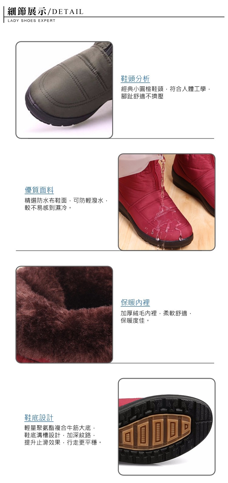 2.鞋類商品依功能及用途之不同,鞋底各有其止滑係數之個別不同,使用鞋類商品請用於正常平坦之路面,非雨鞋或雨靴類商品,請避免穿著於下雨濕滑路面上行走。