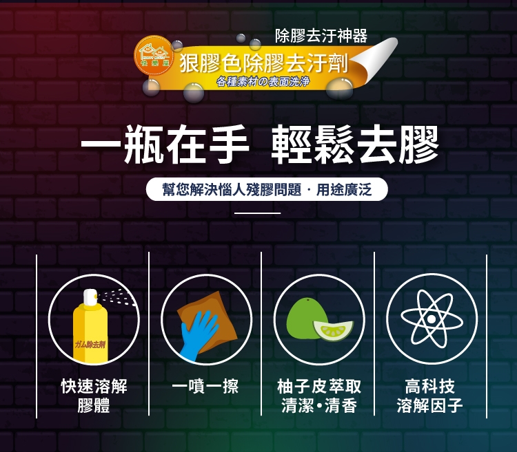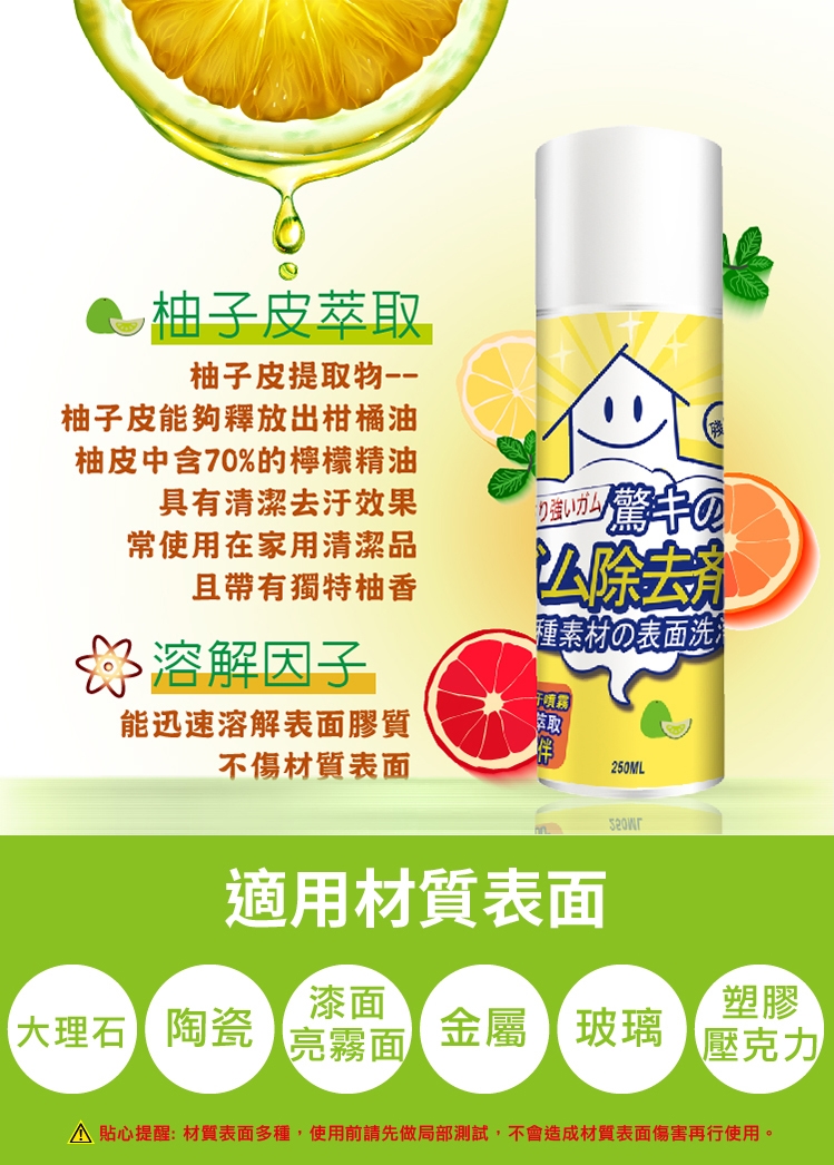 軟化膠質,輕輕一擦即清潔去污,還你乾淨光滑表面;使用柚子皮萃取物,環保且去汙力強。