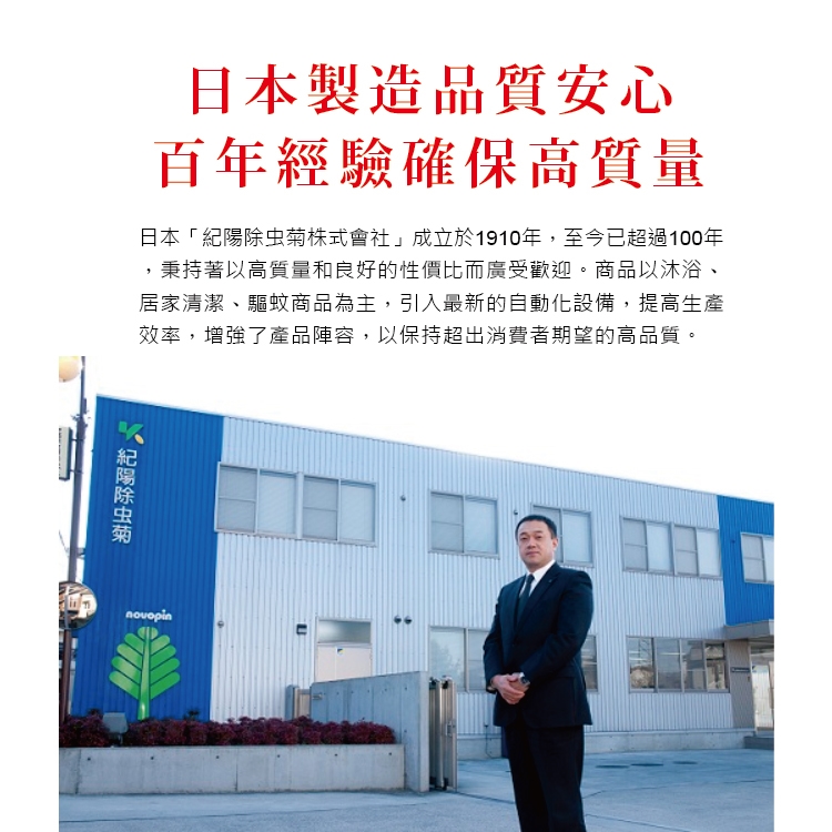 ●日本製造品質安心,百年經驗確保高質量:日本「紀陽除虫菊株式會社」成立於1910年,至今已超過100年,秉持著以高質量和良好的性價比而廣受歡迎。