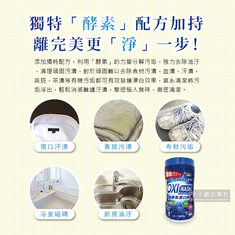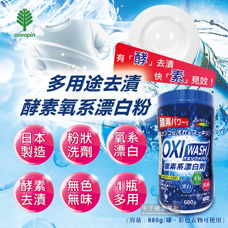 ●「氧系」粉狀漂白劑,花色衣物也適用:這種含氧漂白粉是一種溫和的漂白劑,主要成分為「過碳酸鈉」,泡在水中無色無味,不具腐蝕性使用上可較安心,通常是家庭最常用的漂白劑,可對付洗衣精也無計可施的髒污或臭味。對衣料而言較為溫和,可深入纖維,達到清除色素、汙垢的效果,適合漂白淡色衣物,甚至花色衣物也適用。●獨特「酵素」配方加持,離完美更「淨」一步!添加獨特配方,利用「酵素」的力量分解污垢,強力去除油汙,清理頑固污漬,對於頑固難以去除食物污漬、血漬、汗漬、黃斑、茶漬等有機污垢都可有效發揮漂白效果,氧系清潔將污垢浮出,輕鬆消滅難纏汙漬,擊退惱人臭味,徹底清潔。●居家清潔1瓶多用,漂白消臭1次搞定:漂白劑可說是衣物及居家清潔的好幫手,除了去除黃漬汙垢,針對除臭也效果顯著。不僅可洗滌衣物領口、布鞋、寵物墊、床單血漬、地毯汙漬;連廚房油汙、浴室磁磚和餐具汙漬都可清洗;甚至抽風扇上的黏膩油汙也可強力洗淨,漂白的同時也可除臭,是居家清潔的好幫手。●簡單3步驟,調配最佳比例:(1)使用前請戴上家事用塑膠手套。