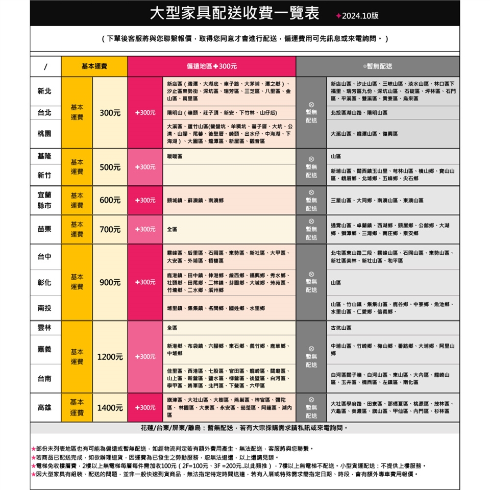 配送範圍:台灣本島,花蓮台東屏東全區、外島皆不配送,實因特殊地型限制(山區、鄉、鎮、村)、樓梯太小、無法搬運上樓等因素,導致無法配送,本公司保有出貨的權利。