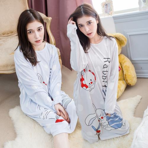 lingling日系 舒適牛奶絲似棉圓點小兔子直條紋字母長袖連身睡衣裙(全尺碼,2色可選)