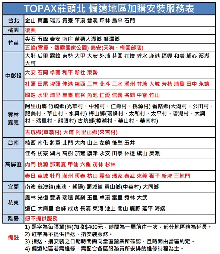 •可預約送貨及安裝時間為周一至周五,台北地區為早上10:00~下午5:00,實際安裝時間電話聯絡為主。