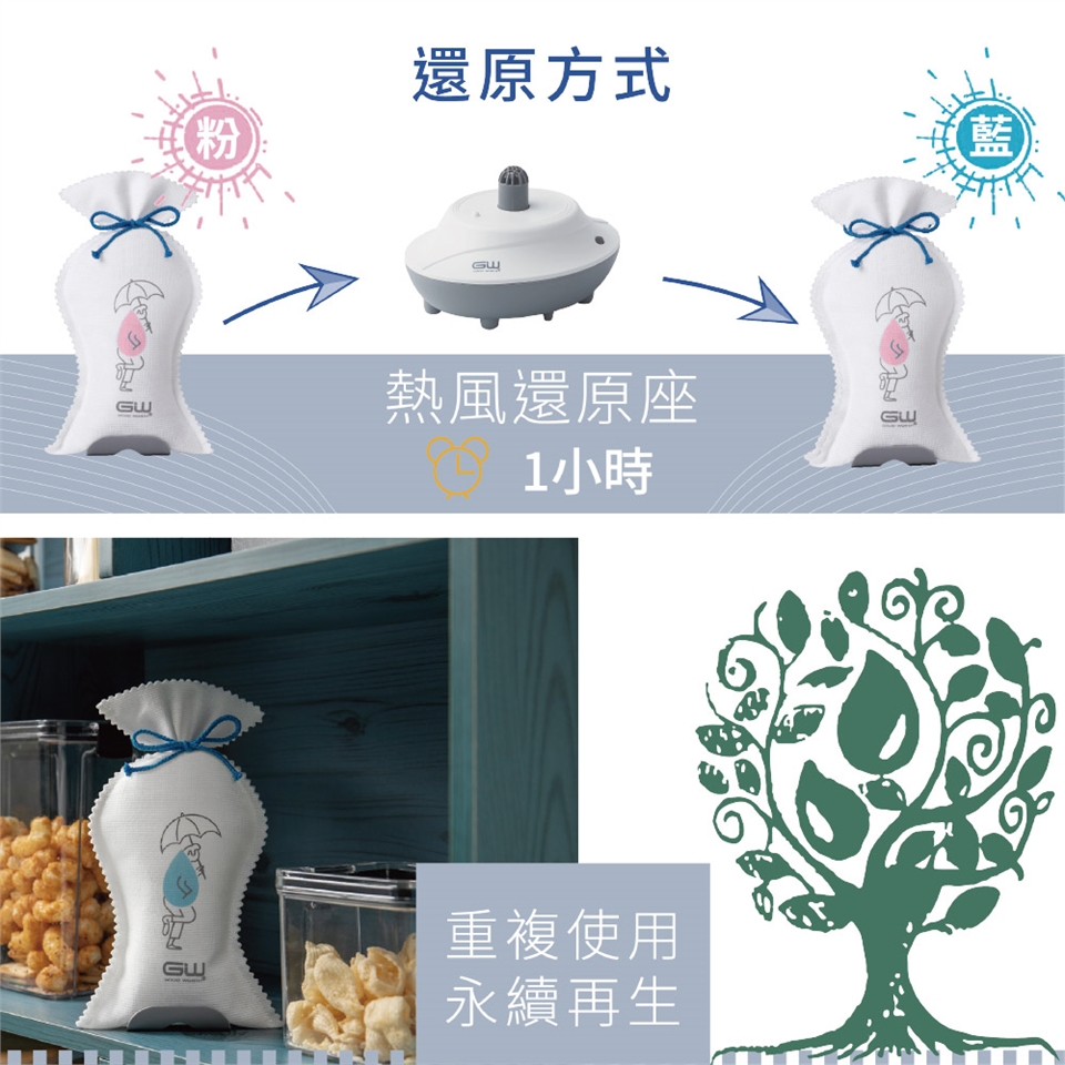 變色指示若為淡粉色,請先放至於熱風還原座上,待變成淡藍色再進行除溼。