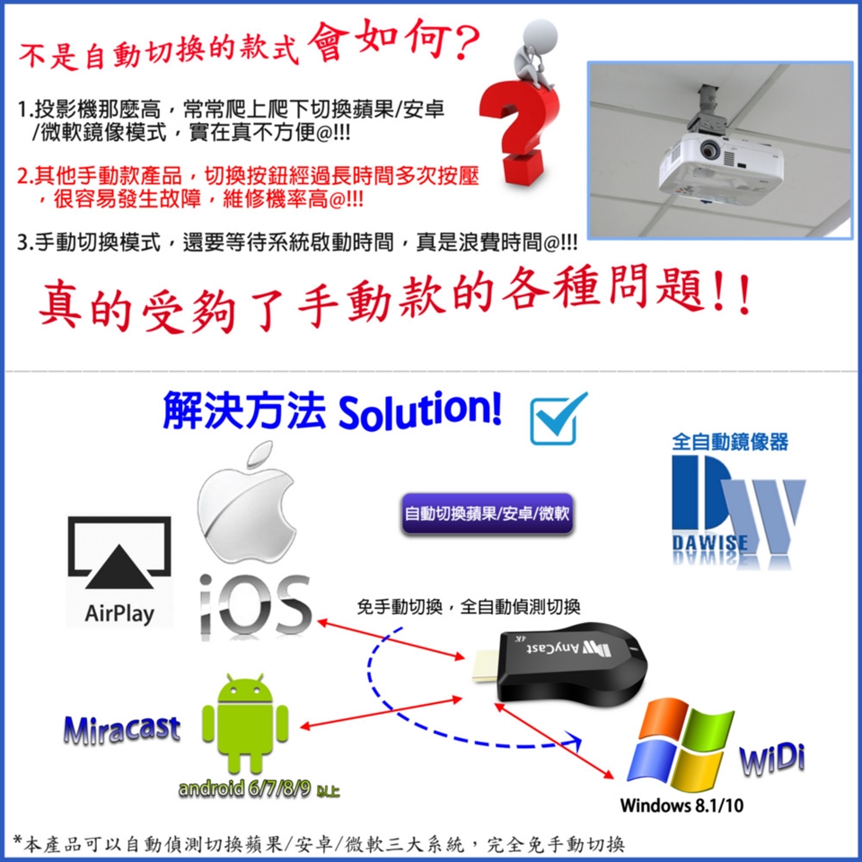 支援影音同步傳輸模式: AirPlay/Miracast/DLNA/WIDI