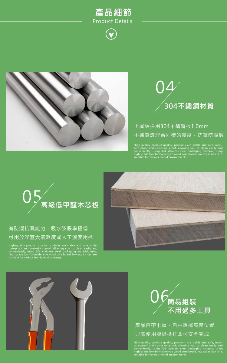 產品材質:304不鏽鋼、低甲醛木芯板、角鋼