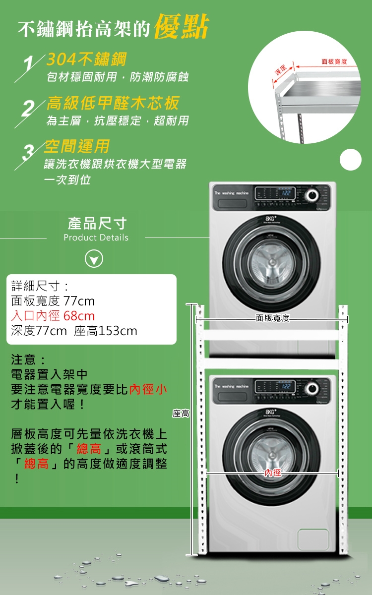 層板高度可依洗衣機"上掀蓋式或滾筒式"的高度做適度調整
