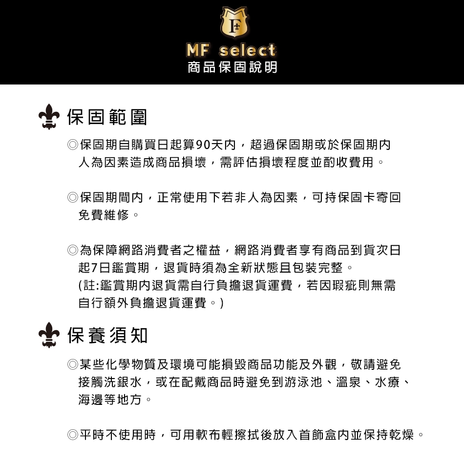 ◆ 飾品請勿直接接觸海水、雨水、清水,無論是洗手、入浴、就寢、運動、游泳、三溫暖,請先將飾品取下收妥,以延長飾品壽命。