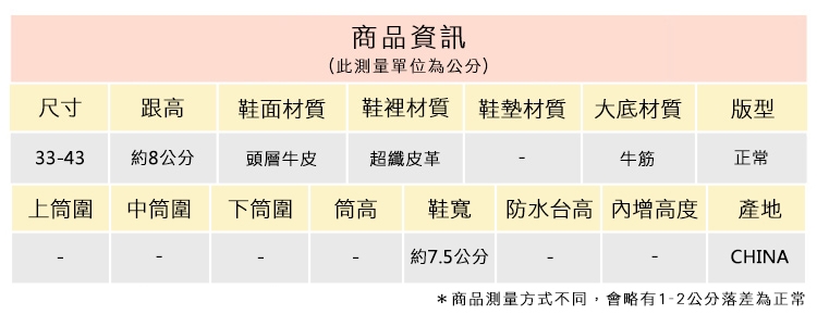 2.鞋類商品依功能及用途之不同,鞋底各有其止滑係數之個別不同,使用鞋類商品請用於正常平坦之路面,非雨鞋或雨靴類商品,請避免穿著於下雨濕滑路面上行走。