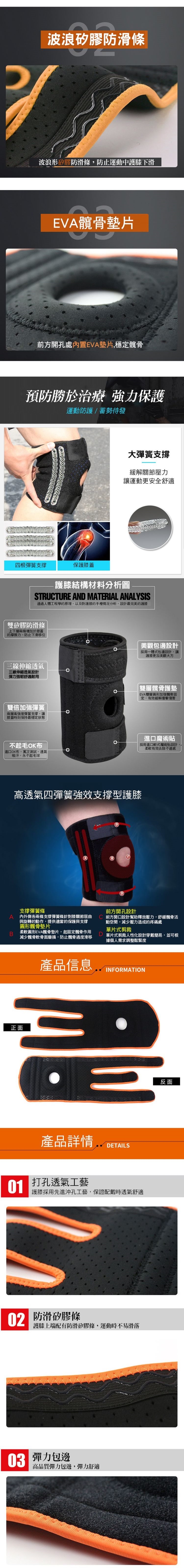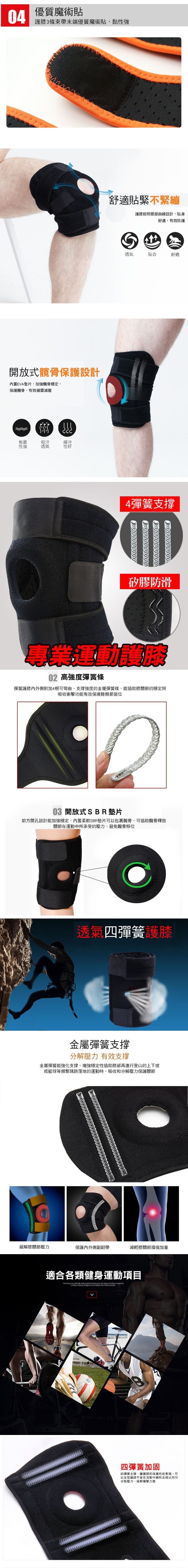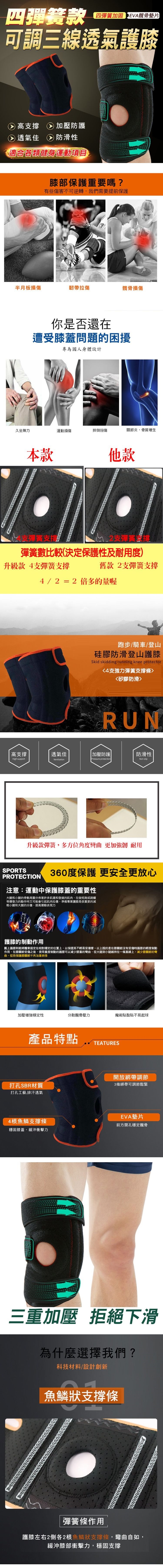 四彈簧款可調三線透氣護膝 雙側邊新升級為4彈簧(2側各2支)款 , 保護膝蓋二側更升級