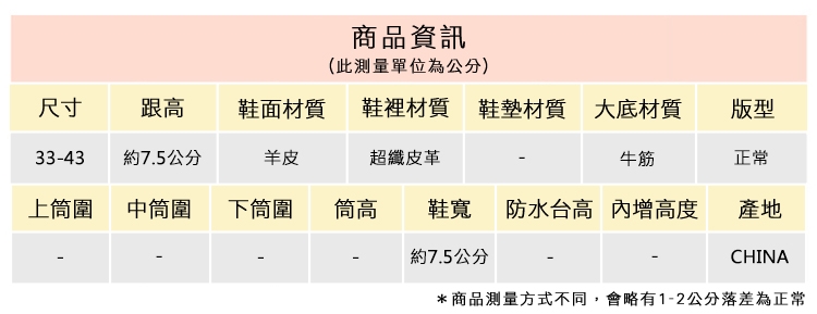 2.鞋類商品依功能及用途之不同,鞋底各有其止滑係數之個別不同,使用鞋類商品請用於正常平坦之路面,非雨鞋或雨靴類商品,請避免穿著於下雨濕滑路面上行走。