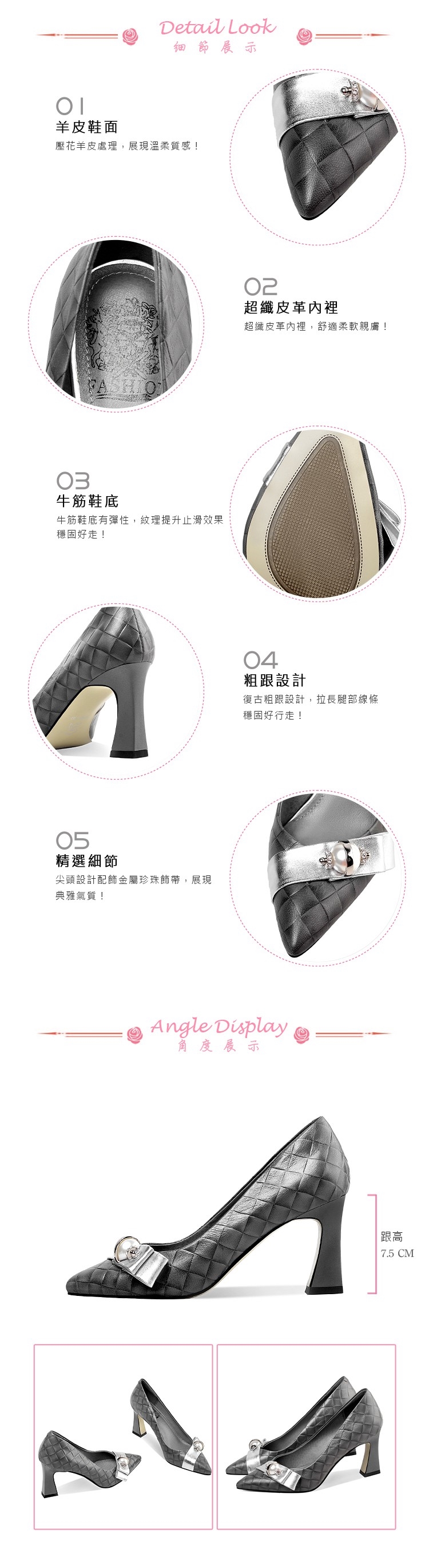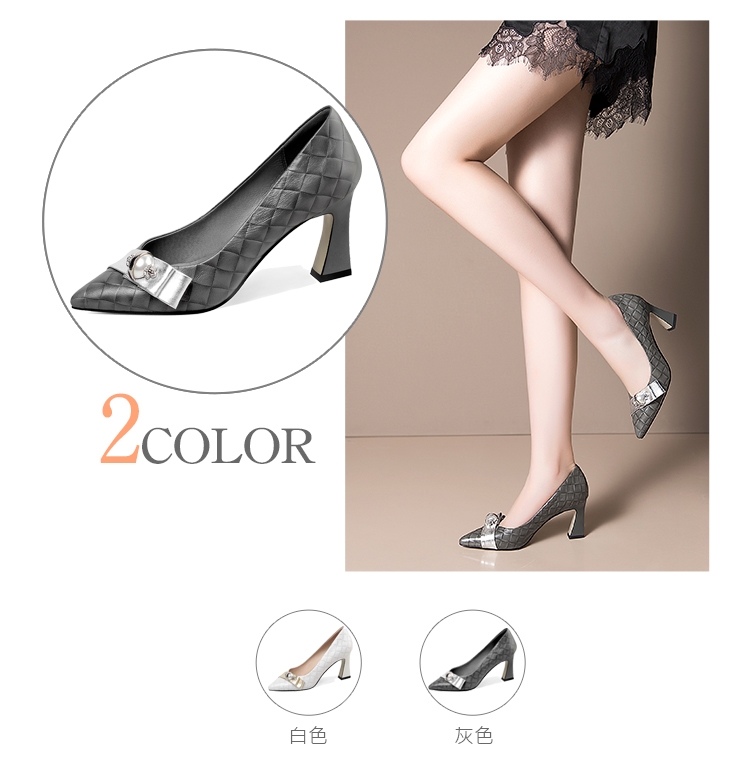 【Kissxxx】真皮細膩羊皮尖頭復古金屬珍珠飾帶高跟鞋 灰