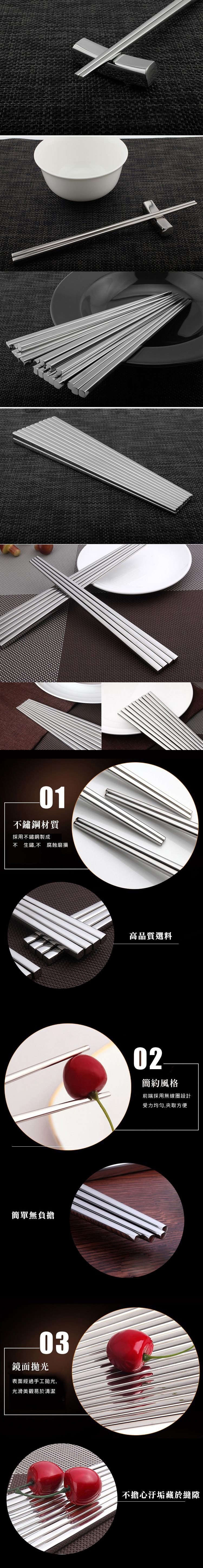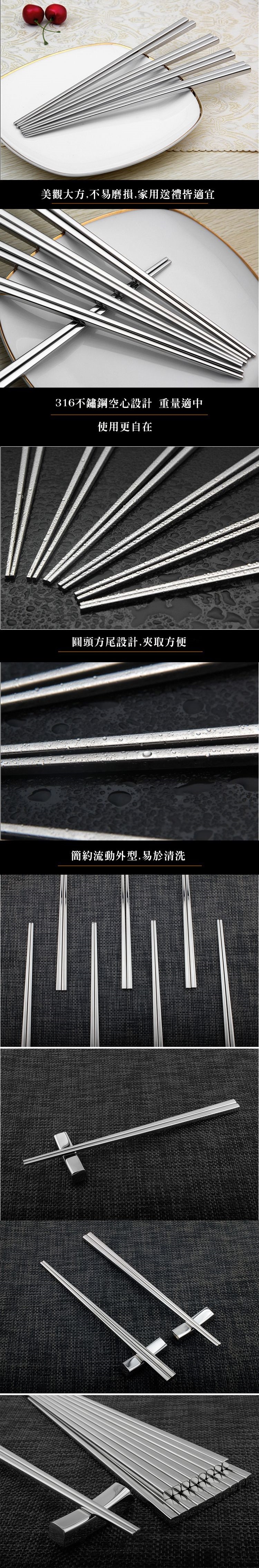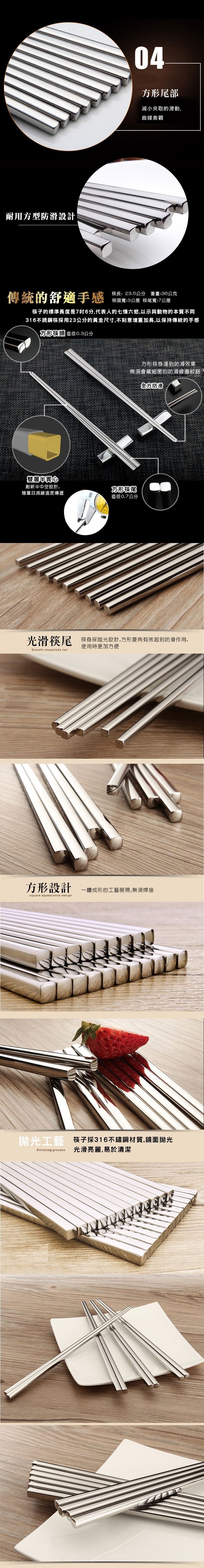 316不鏽鋼超耐用加長方形筷,方形設計,不易滾動掉落,加長設計,使用起來更順手,輕鬆享受美味!耐高溫材質,適合烹調使用,並可高溫殺菌消毒,不怕孳生細菌!無線圈紋路設計,縫隙不藏汙納垢,高品質316不鏽鋼,外觀經打磨,觸感細緻亮晶晶!用好餐具,吃得安心!