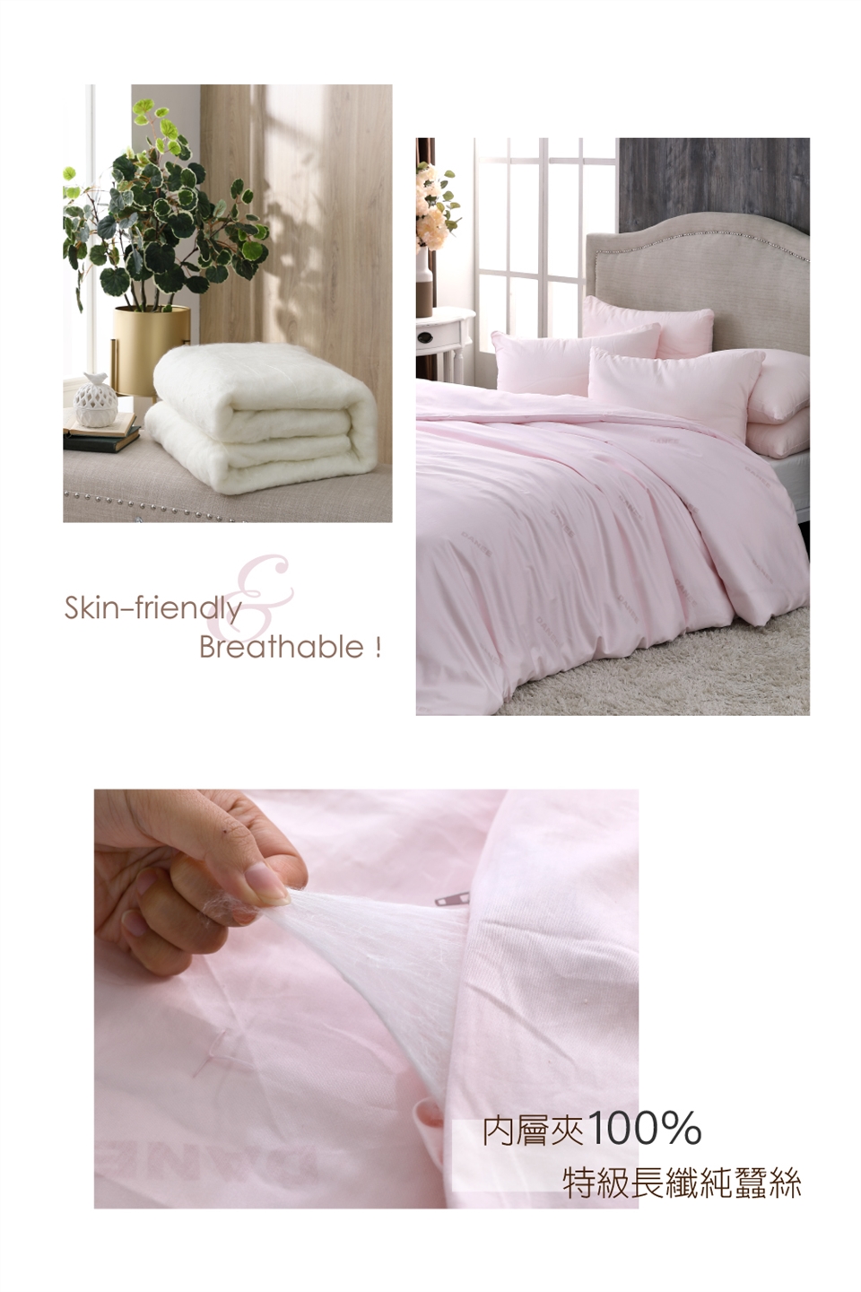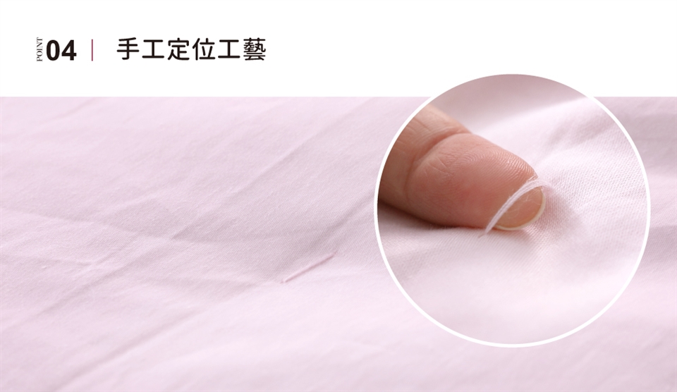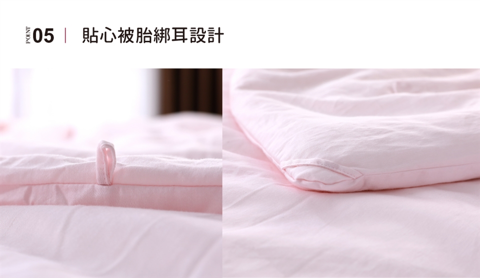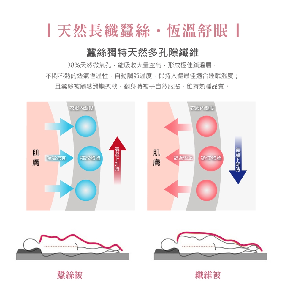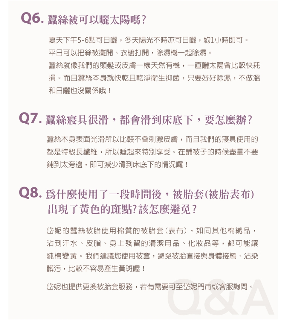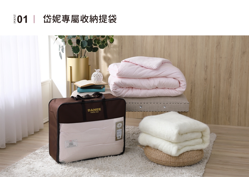 ► 避免放置樟腦丸於被內。避免重壓或用真空收縮袋收納,維持蠶絲內胎結構及蓬鬆度。