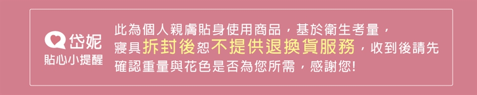 ► 基於衛生健康問題與維護顧客權益,貼身內褲、口罩、眼罩、襪子以及所有寢具商品,在您還不確定是否要辦理退貨前,請勿拆標與使用。