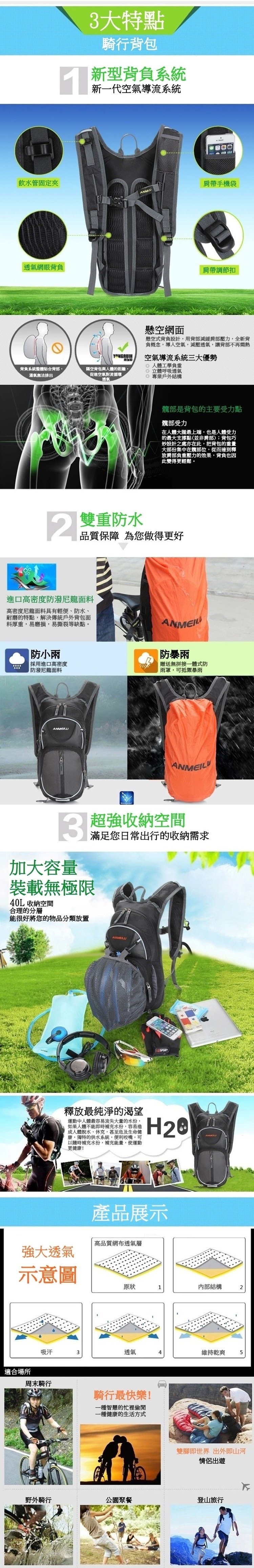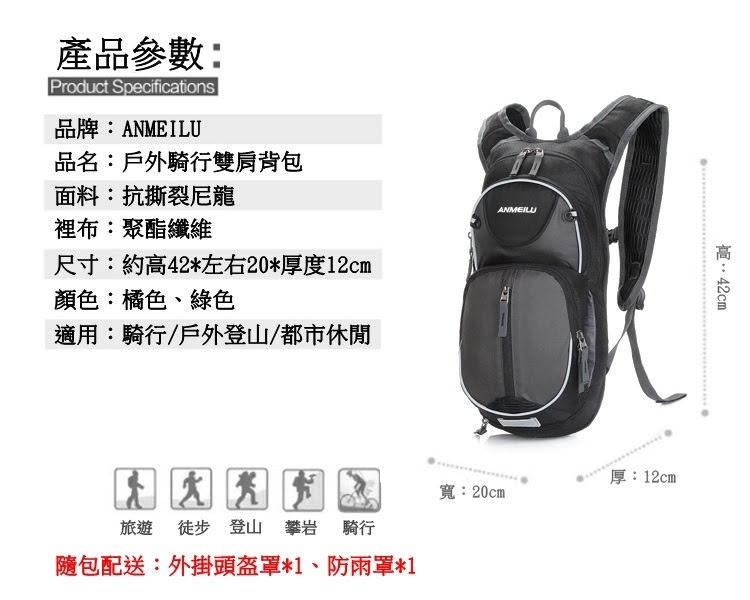 ●【品名】ANMEILU戶外雙肩騎行背包1010(15L,附防雨罩及頭盔網,不含水袋,水袋需另外購買!)