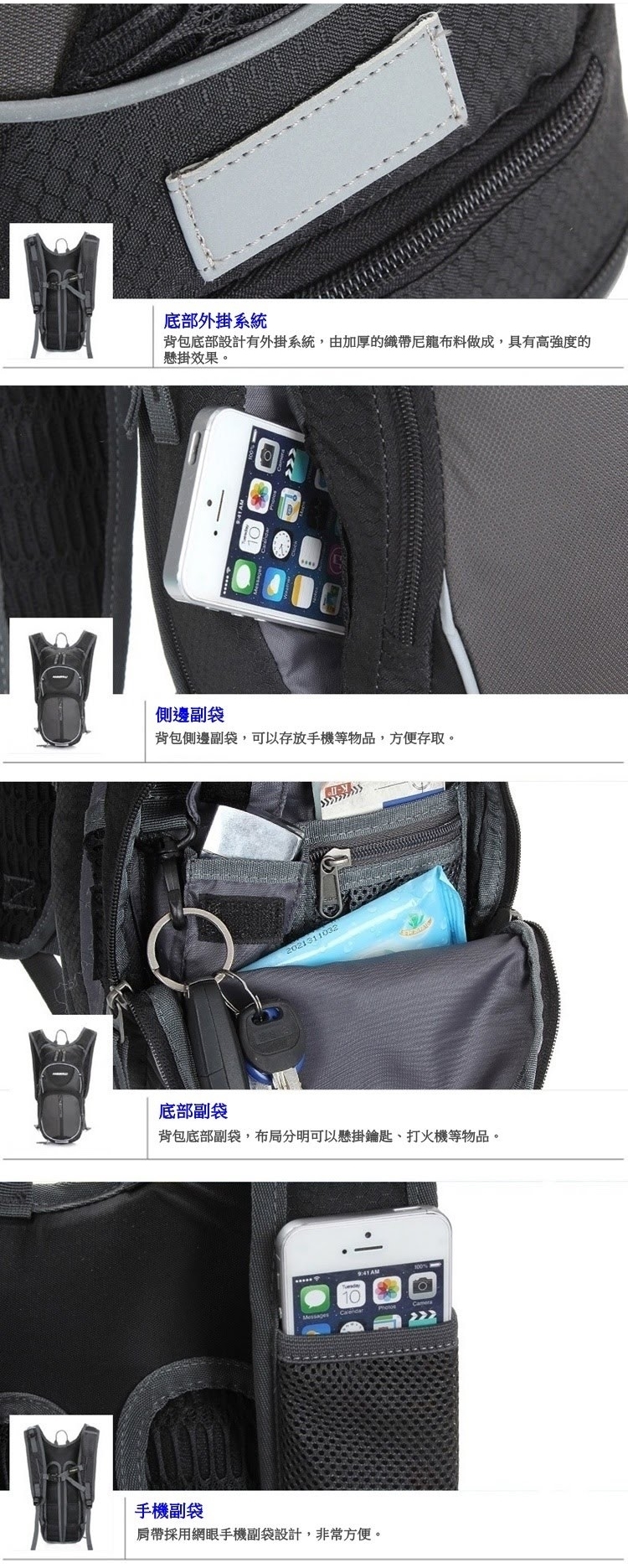 (2)背包前部下面副袋附防雨罩,讓您安心防雨;另外有背包底部附有頭盔網,可以讓您旅途中方便存放頭盔等其他物品。