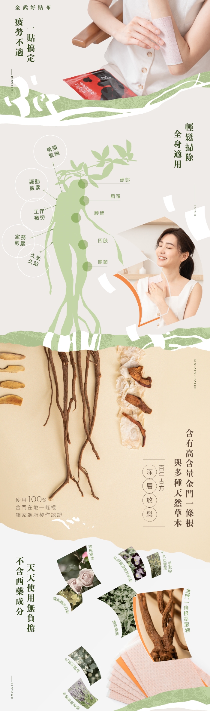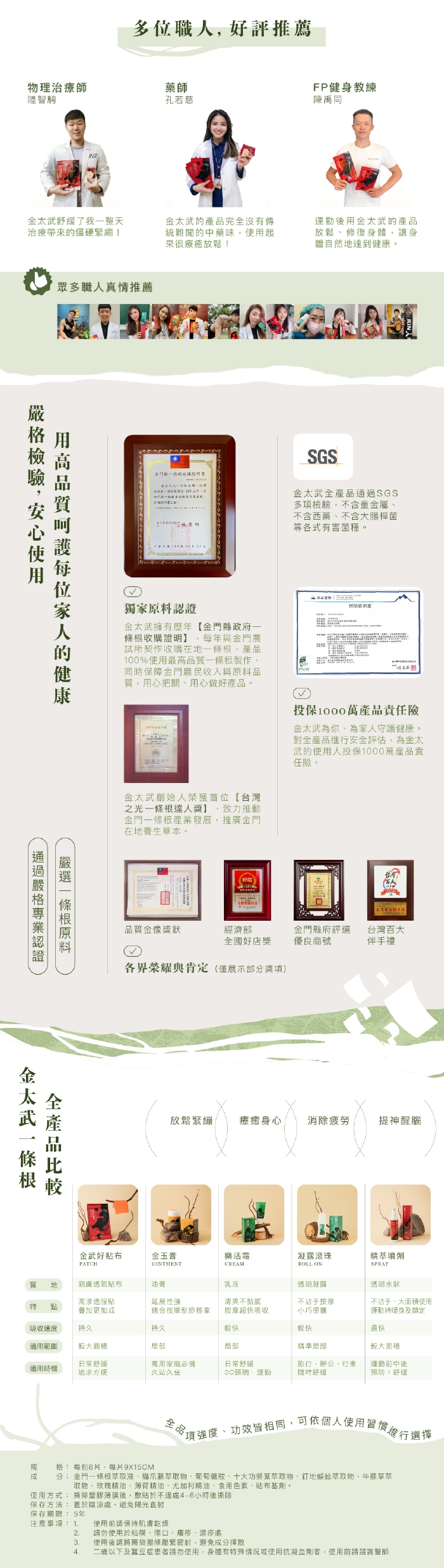 成分:金門一條根萃取液、貓爪藤萃取物、葡萄糖胺、十大功勞葉萃取物、釘地蜈蚣萃取物、牛膝草萃取物、玫瑰精油、薄荷精油、尤加利精油、食用色素、貼布基劑。