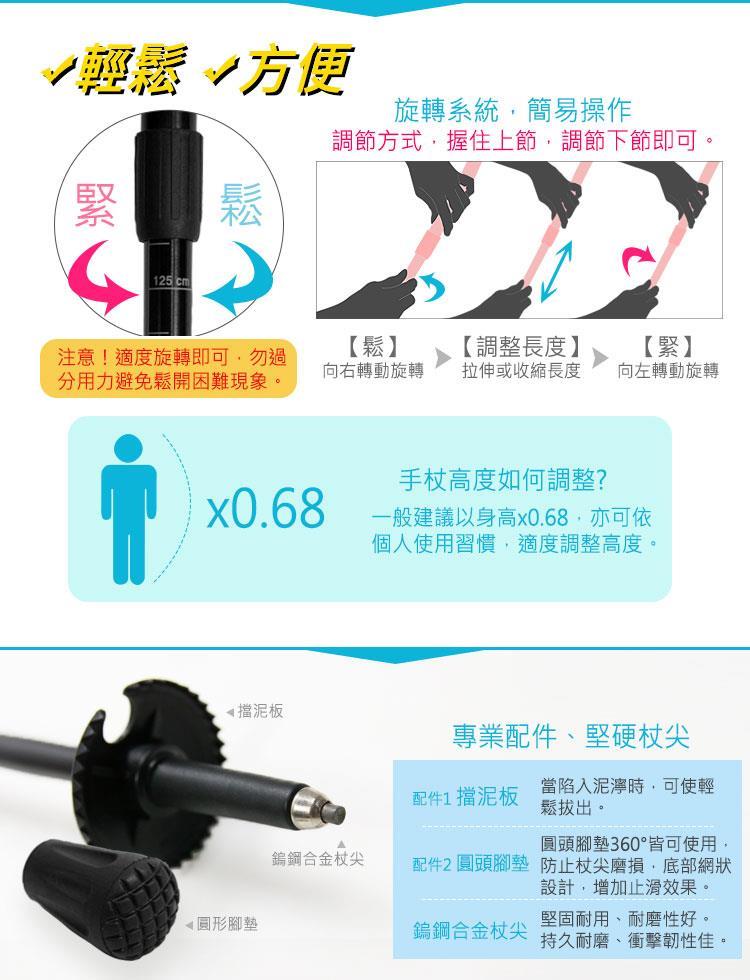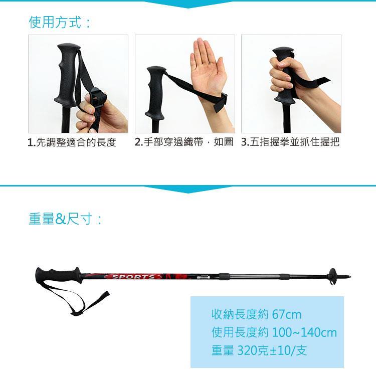 1.此杖除作為登山、健走、徒步旅行用途之外,請勿做為其他用途。br/2.使用前和使用中,必須確認好各節是否有鎖緊固定住。br/3.若在使用中有斷裂,破損、變形或發現瑕疵時,請立即停止使用。br/4.請勿任意分解及改造本產品。br/5.未成年請在成人監督下使用本產品。br/6.本產品請勿使用在任何油類、潤滑油塗抹在桿身、桿內或任何地方。br/7.網頁圖文來不及更新時,請依實際收到商品為準。br/商品圖檔顏色可能因電腦螢幕設定差異略有不同,請依收到之實品為準。br/辦理商品退換貨時,如有贈品或配件,麻煩請一併寄回,否則視同缺件無法受理!