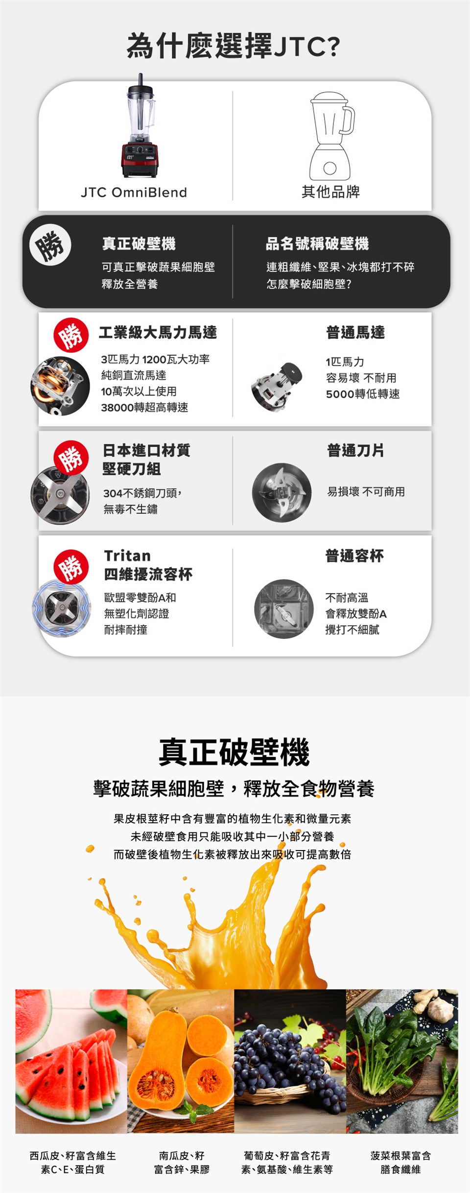真正破壁機!不是市面上只是品名叫”破壁機”,卻濫竽充數的劣等品質機器。 要能真正擊破蔬果細胞壁,需有大又剛強的刀,搭配快速的轉速與超強的馬達扭力,獨特設計的杯子導流,缺一不可的三合一搭配,才真正能擊破蔬果細胞壁,釋放植化素。 但那些虛有其名的所謂”破壁機”,小小刀片,弱弱的馬力,堅果都無法打到綿密細緻,冰塊也打不碎,更遑論打養生綠拿鐵精力湯常用的食材都有較粗的纖維,這些機器根本沒有能力處理。 所以不但打不動打不細,且使用半年一年機器就掛了。