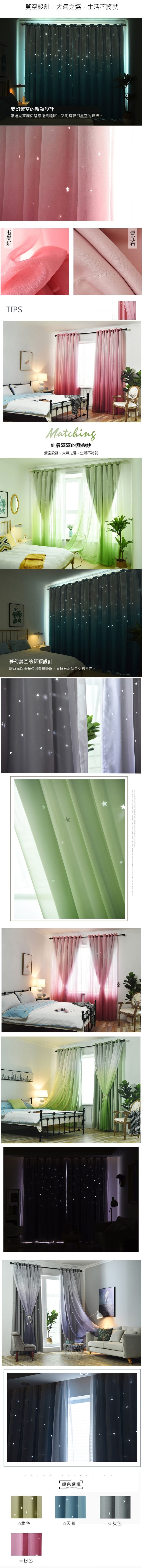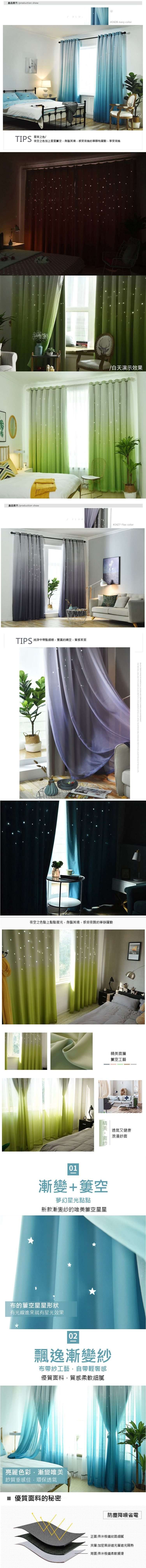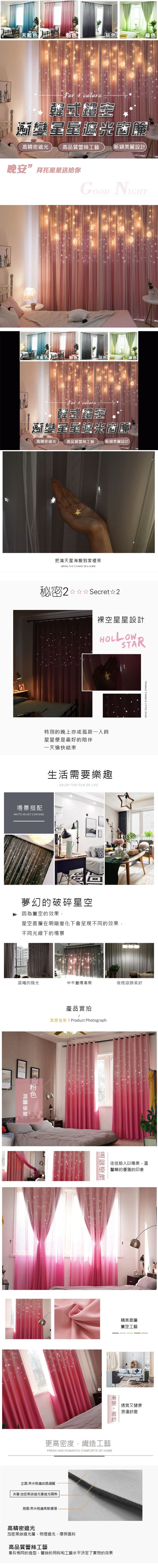 韓式鏤空漸變星星遮光窗簾,材質新升級並加入漸層色創意鏤空設計,讓居家空間顯得"簡約不簡單",並且具有獨特的時尚美感~ 晝夜會給人有兩種不同的視覺效果,讓你體驗到唯美、夢幻、浪漫的氛圍,隨時都像是在仰望星空,享受彷彿置身雲端般的溫馨舒暢~兩種尺寸多色任選!