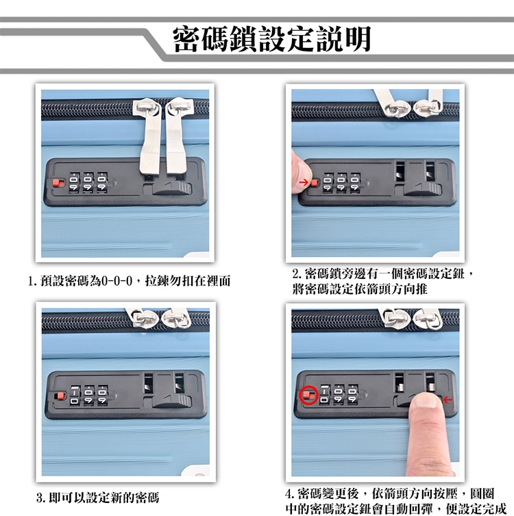 此款行李箱為固定式 三碼密碼鎖,需自行設定專屬密碼。