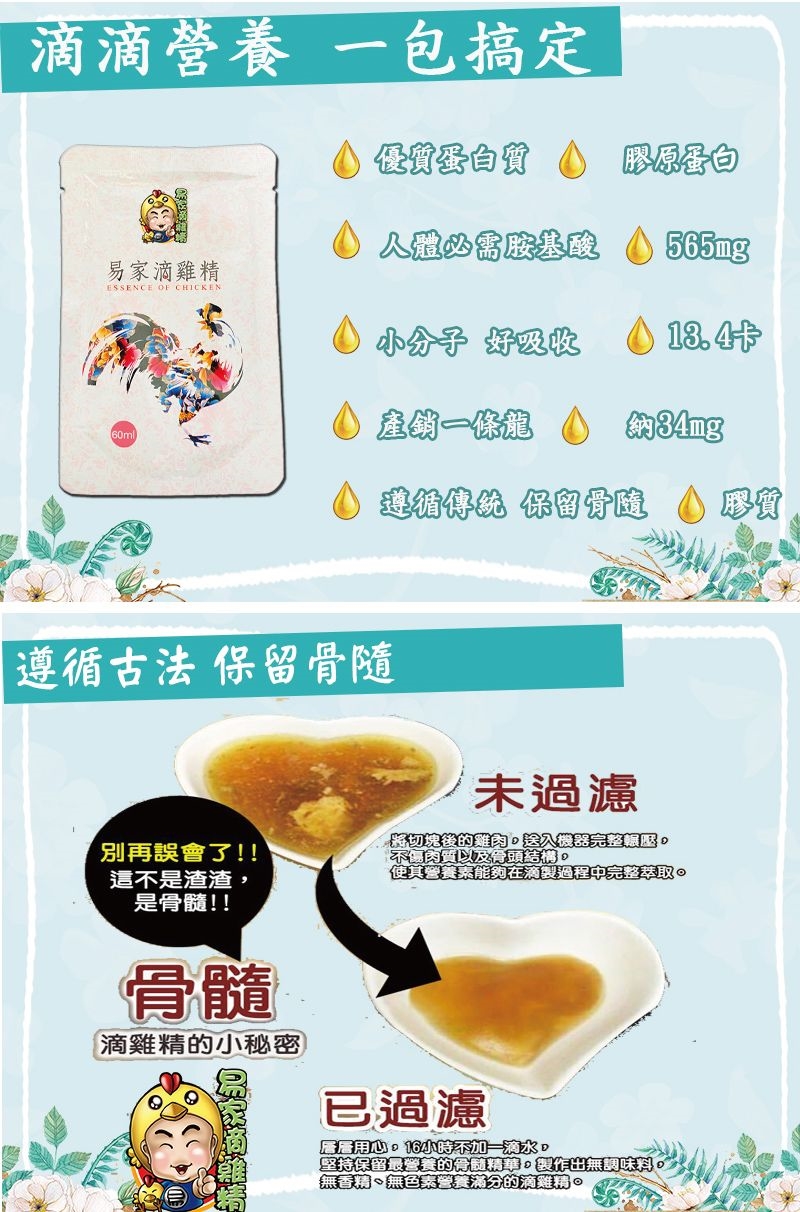 ✔️遵循老一輩智慧,再創獨家新滴法,層層滴煉,不加一滴水,經過16小時慢煉,並去除油脂、雜質,保留了滴雞精完整的營養及骨髓