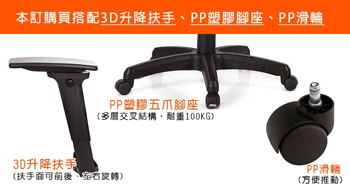 本訂購頁規格:3D升降塑鋼扶手、塑膠腳座、PP滑輪
