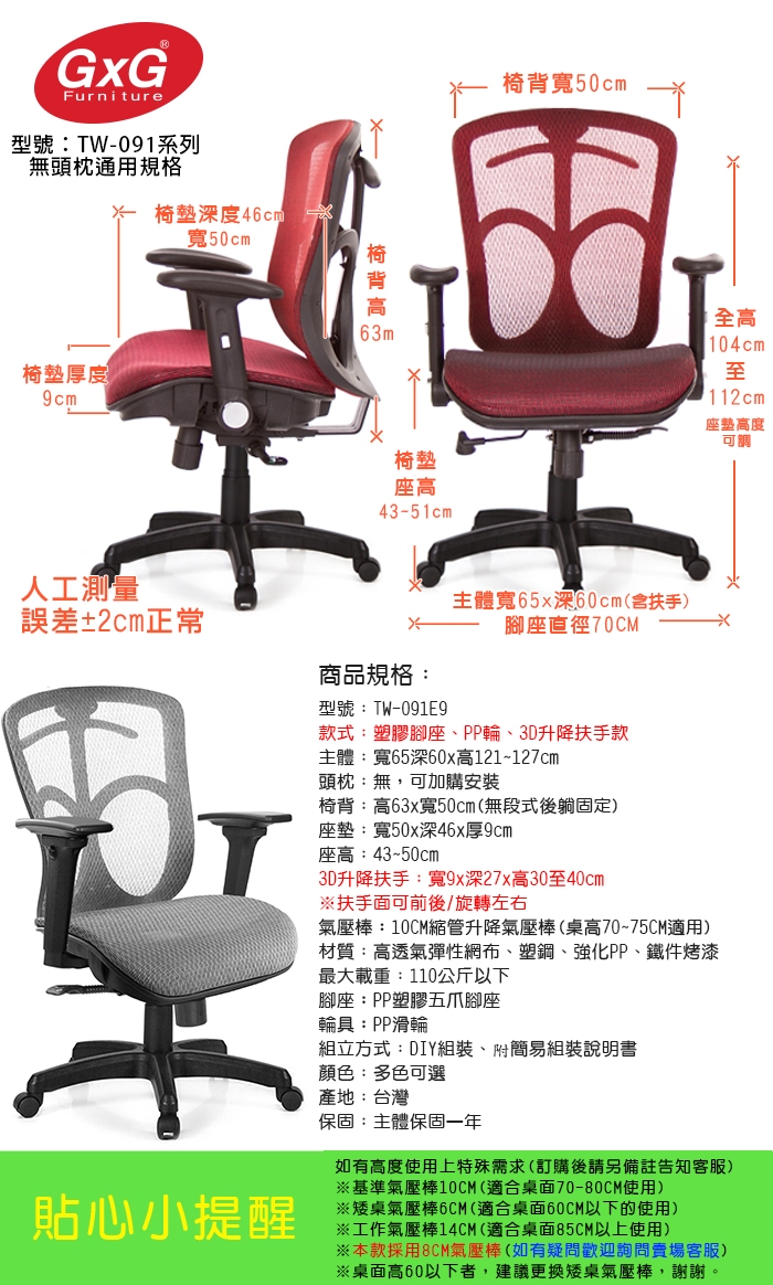 ※小提醒:本款 TW-091電腦椅,適合身高168-180CM的使用者;身高160CM以下使用者,有恐頭枕過高狀況,建議選購無頭枕款式,若有問題可先洽詢賣場客服 。