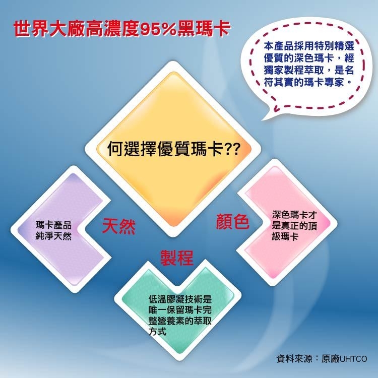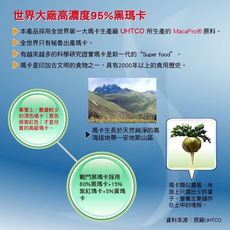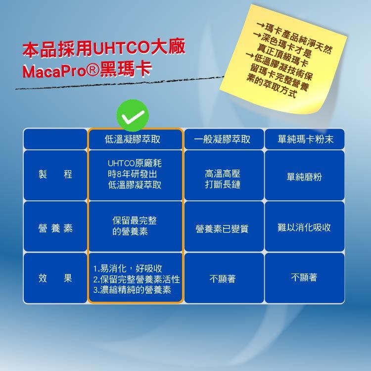 採用UHTCO大廠低溫膠凝萃取的黑瑪卡,保留瑪卡完整營養素。