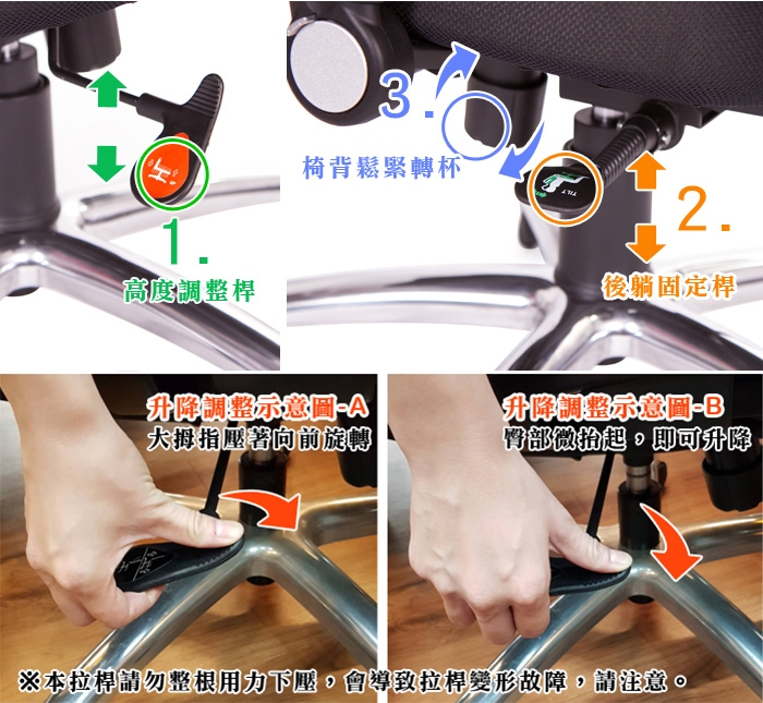 1.座椅高度︰調整高度時,人請先離開座墊,在將拉桿拉起,即可將座墊昇起,若需調降高度,人則需坐在座墊上,在將拉桿拉起,透過身體重量,座面高度即可下降。