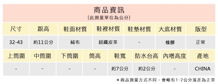 2.鞋類商品依功能及用途之不同,鞋底各有其止滑係數之個別不同,使用鞋類商品請用於正常平坦之路面,非雨鞋或雨靴類商品,請避免穿著於下雨濕滑路面上行走。