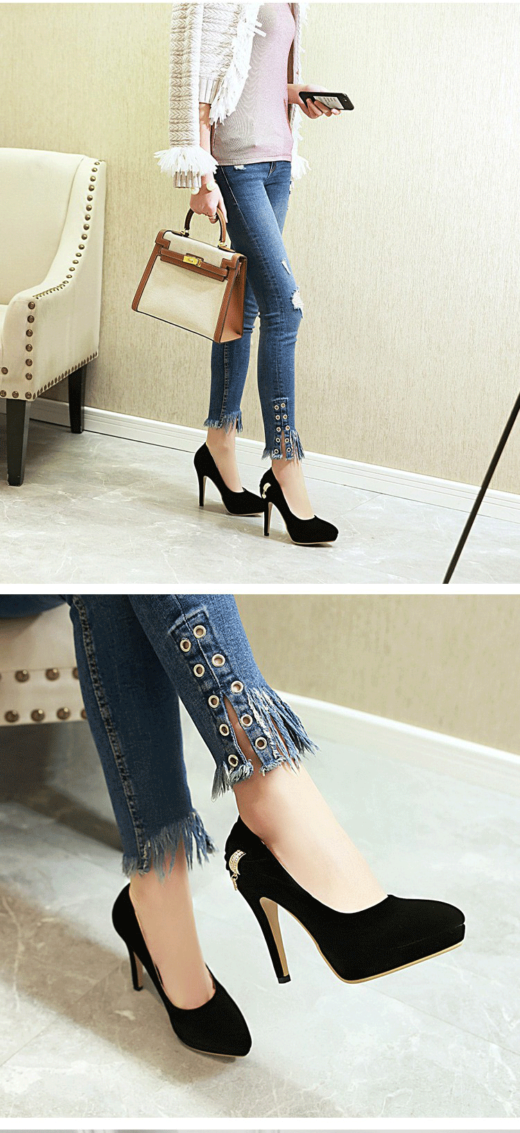 【Kissxxx】經典絨面蝴蝶結鑽釦造型防水台尖頭高跟鞋 黑