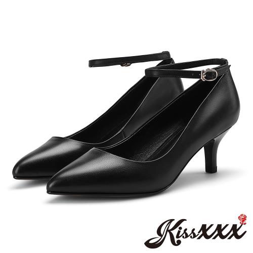 【Kissxxx】真皮頭層牛皮尖頭淺口腳踝繫帶造型5.5CM高跟鞋 黑